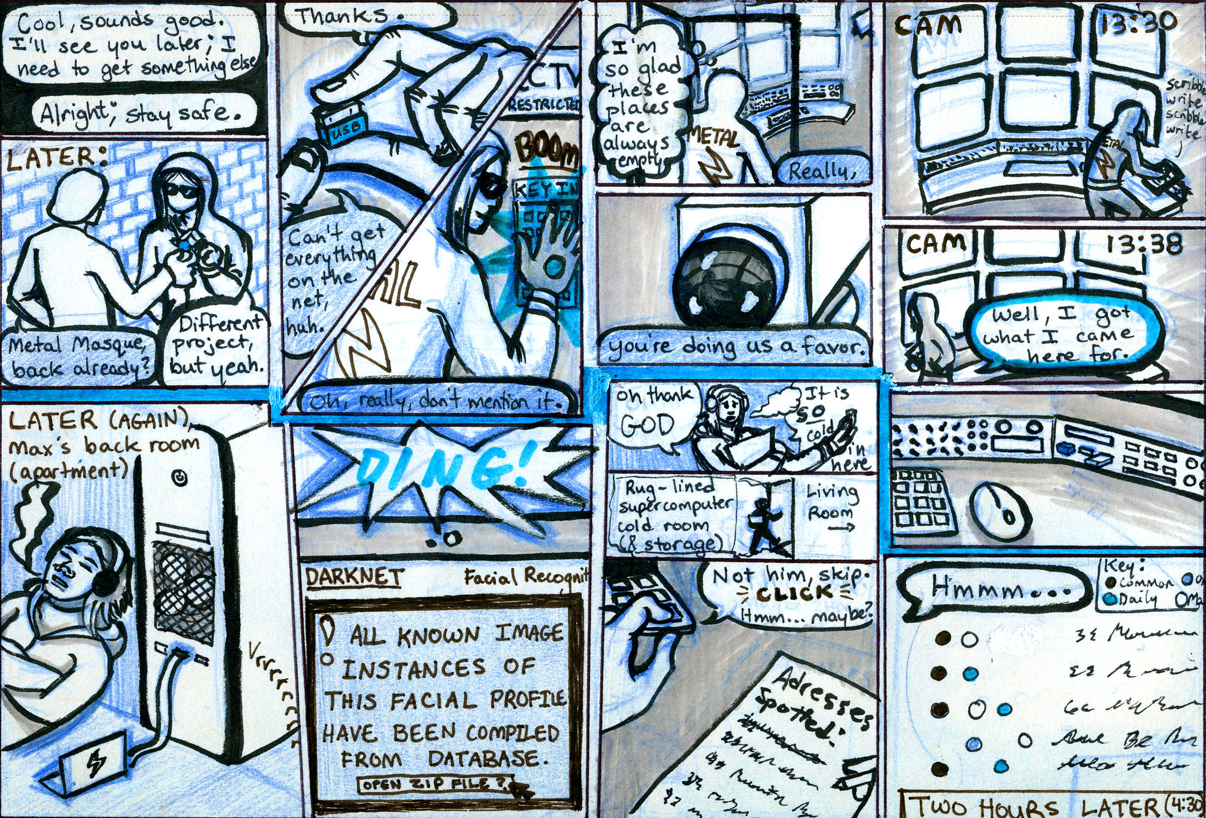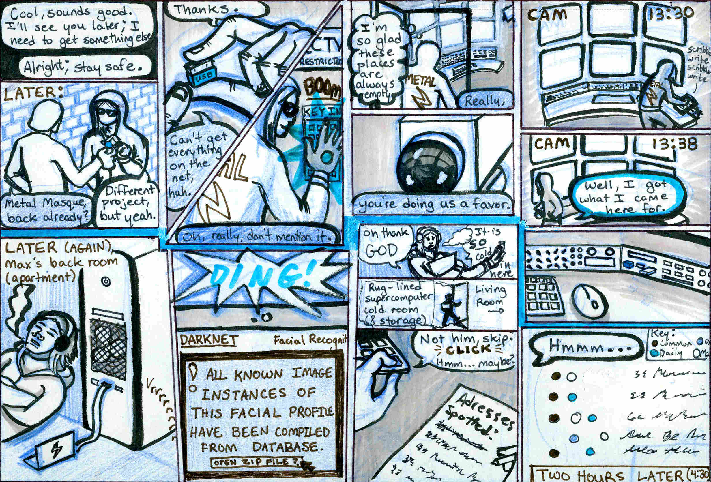 In case anybody cared, Max followed standard procedure for using the CCTV cameras: broke in, change the feed to the City Hall, and change the time to 14:25. It's always a different set of people, and since usually whatever you need to do is through hacking, the police, if they DO see what you're looking at, are baffled. There are a lot of different rules that the supervillain community in Montreal adhere to, and I'm really excited to show you what kind of rules Max will be following - or breaking - and the kind of gear he has in the coming issues (yes, those were gloves that short-circuit the keypad, and he DOES have a supercomputer in his broom closet, and there IS a black market dealer for high tech hacking gear, and there IS a darknet but in this universe it's more of a supervillains-R-Us on the internet than anything else). Also, more on how the supers in City Hall track villains who break into the CCTV archives next page - look for it!