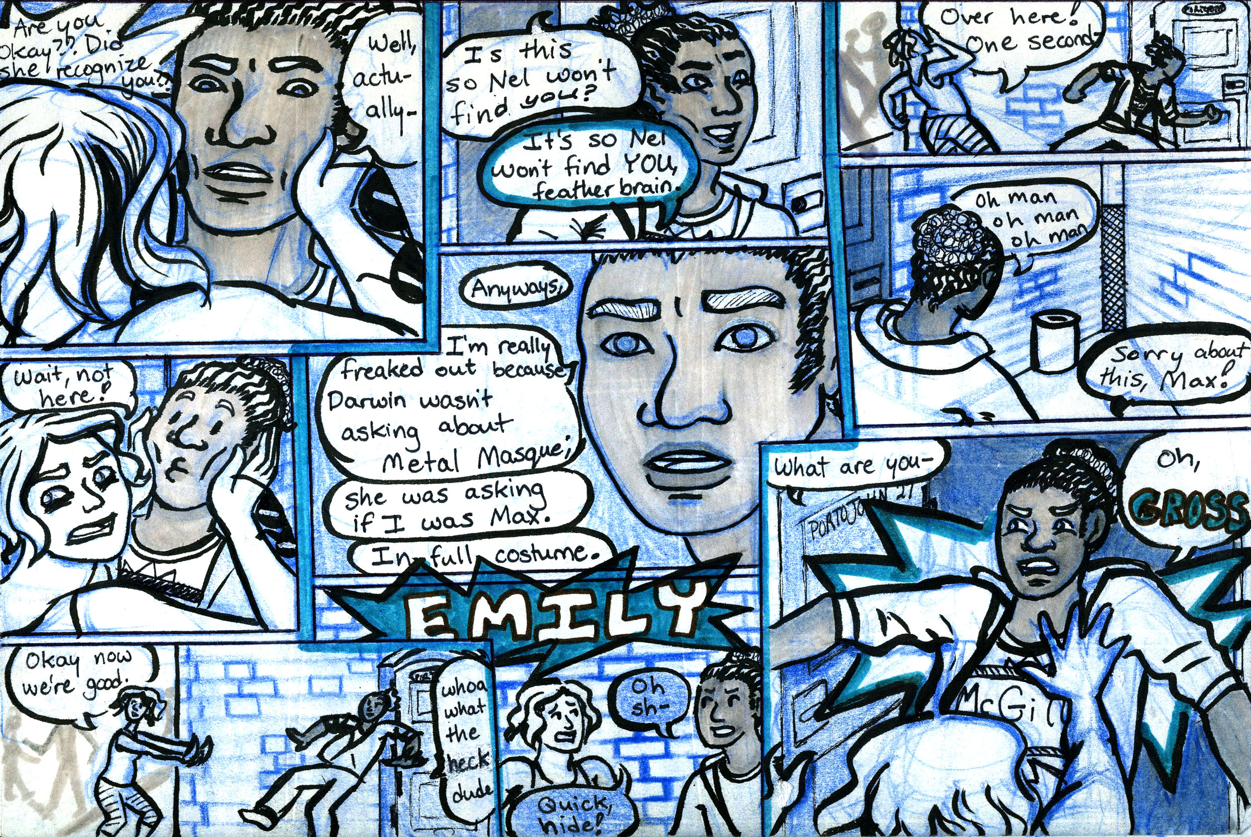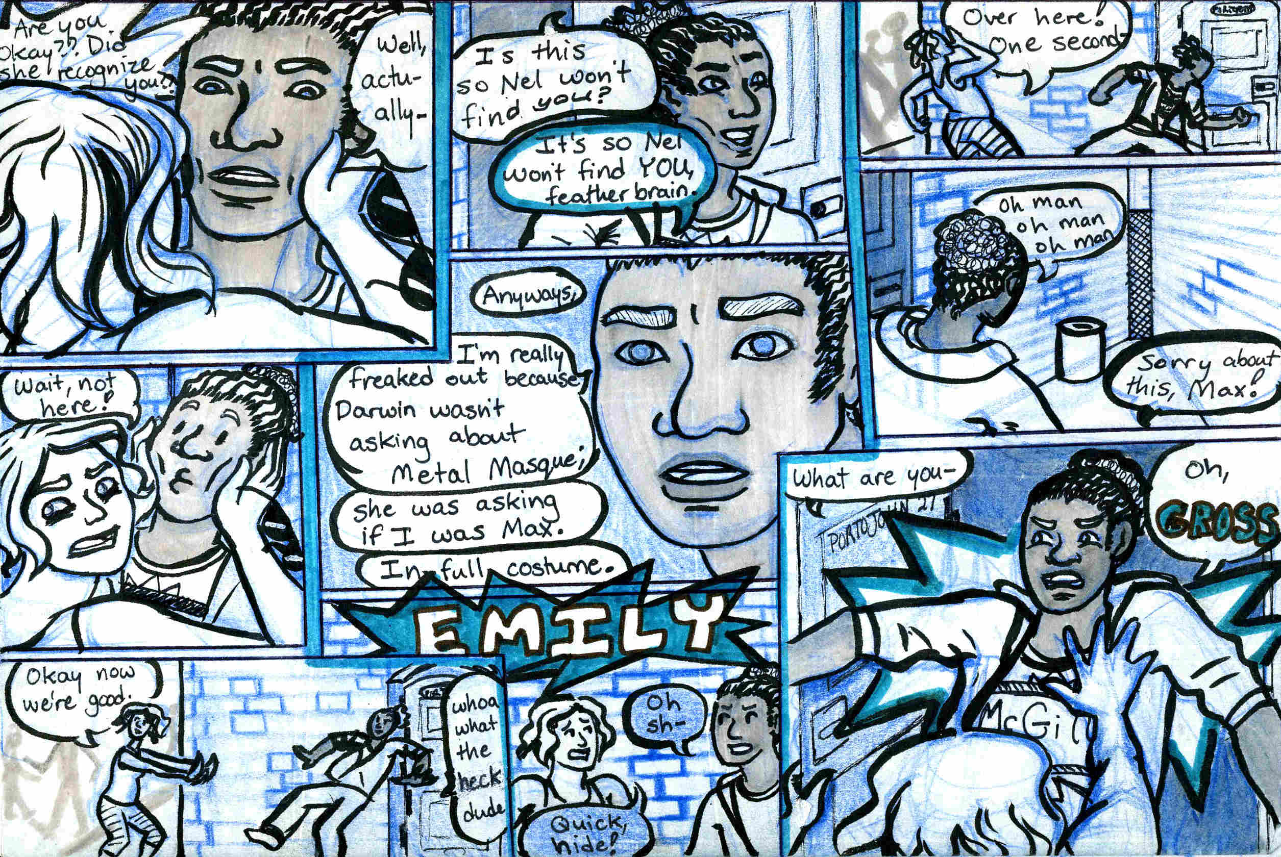 Yes, because clearly the alleyway has the perfect acoustics for stealth. If anyone's wondering, they're doing construction in the area, thus the porto-john, and Em stole Max's glasses to see if he was hiding a black eye. Why Em thinks Darwin would need to punch anyone is beyond me, but panic doesn't always make sense. Also Max is a clean freak, poor soul. Catch you guys Sunday!