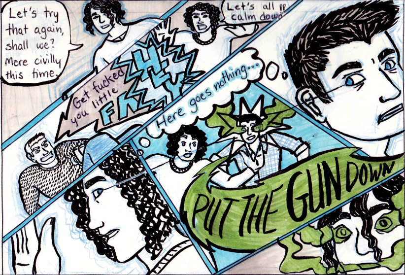 ALSO also, just a quick reminder of the chronological order of chapter 3 so far (there've been a lot of time skips): Page 2, Page 3, Page 4 and 5 simultaneously, Page 6, TV Show Puns (extra), Page 1, and then Page 7, 8, 9, 10, and 11. Hope that clears up any confusion! See ya in a week!