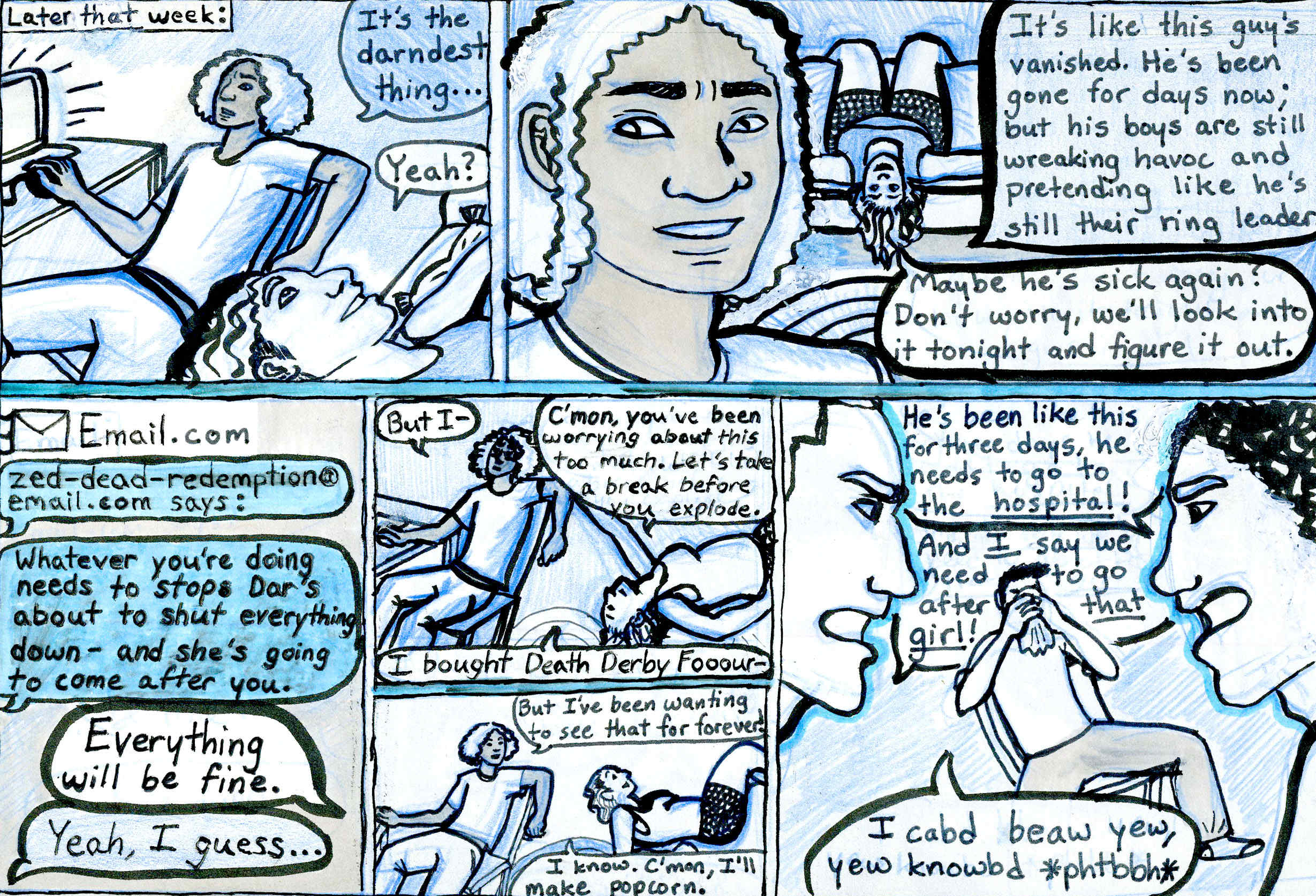 ALSO also, just a quick reminder of the chronological order of chapter 3 so far (there've been a lot of time skips): Page 2, Page 3, Page 4 and 5 simultaneously, Page 6, TV Show Puns (extra), Page 1, and then Page 7, which hasn't been made yet. Hope that clears up any confusion! See ya in a week or two!