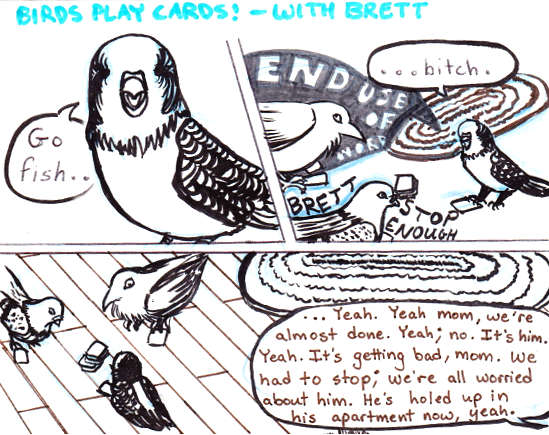 Too many imitations of Jesse Pinkman would annoy even the most patient soul. These next two updates are particularly plot-heavy, so watch out! Next extra reveals who owns Brett, a question which reveals a lot about the bird owner in question. Sorry this is out so late, and as an apology for not having anything out yesterday here's a pen Em! Also, the previous update is now a proper scan, and is full quality, so go check that out.