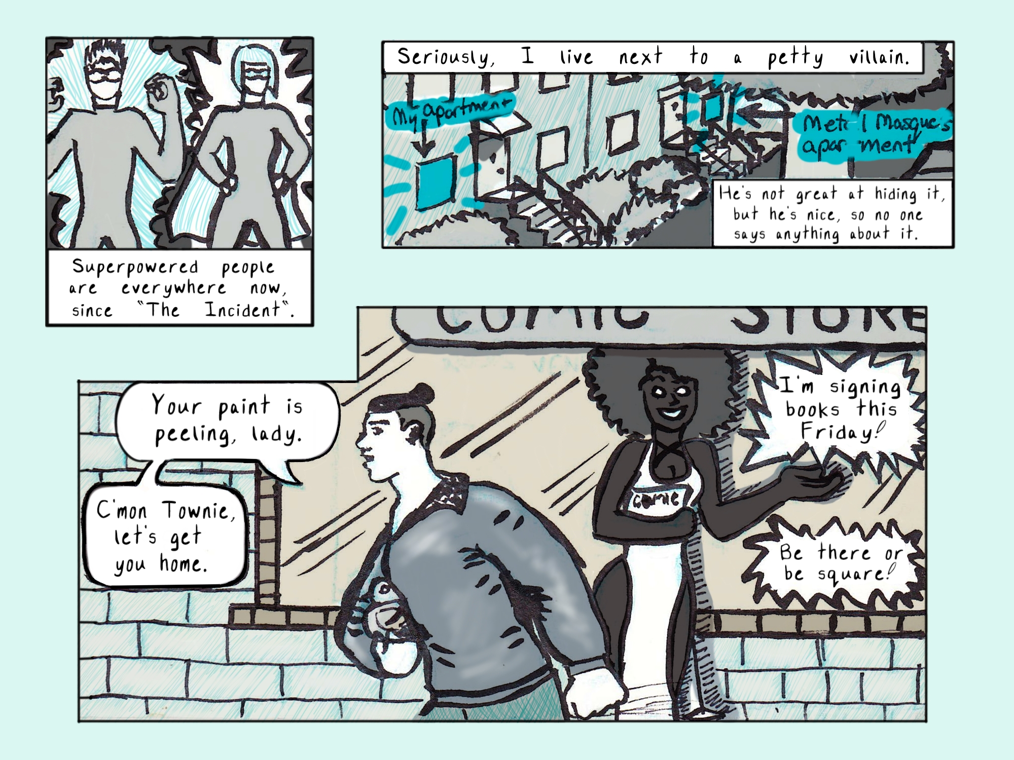 Apparently even a ruler can't help me make straight boxes. I gave up on the bricks. In case it isn't obvious, the lady holding a comic is a talking (pre-recorded message-blaring) cardboard cutout.